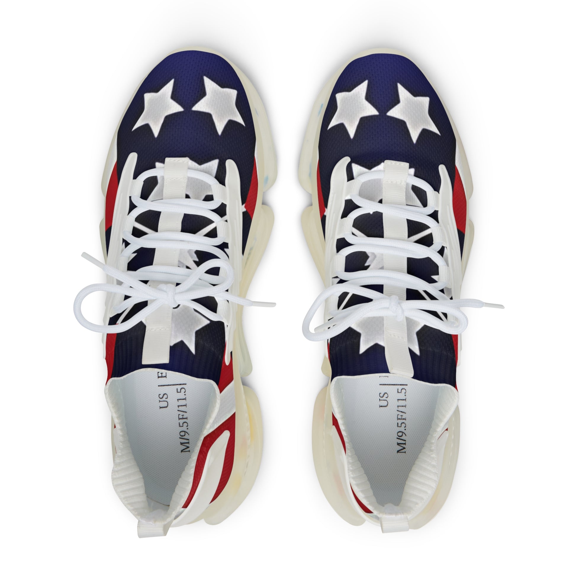 These mesh sneakers bring bold, athletic energy to everyday wear. The vibrant star-and-stripe inspired all-over print sits on lightweight mesh-knit polyester that breathes with every step. Underfoot, an EVA shock-absorbing layer and TPU sole keep movement springy and responsive, while soft deodorant memory foam insoles cradle feet and reduce overheating on long days. Durable KPU accents hold up to regular use and the lace-up closure gives a secure, customizable fit. Choose black or white detailing to match your style; subtle stitching color ties the look together. They feel like freedom on the pavement — bright, active, and built to move.