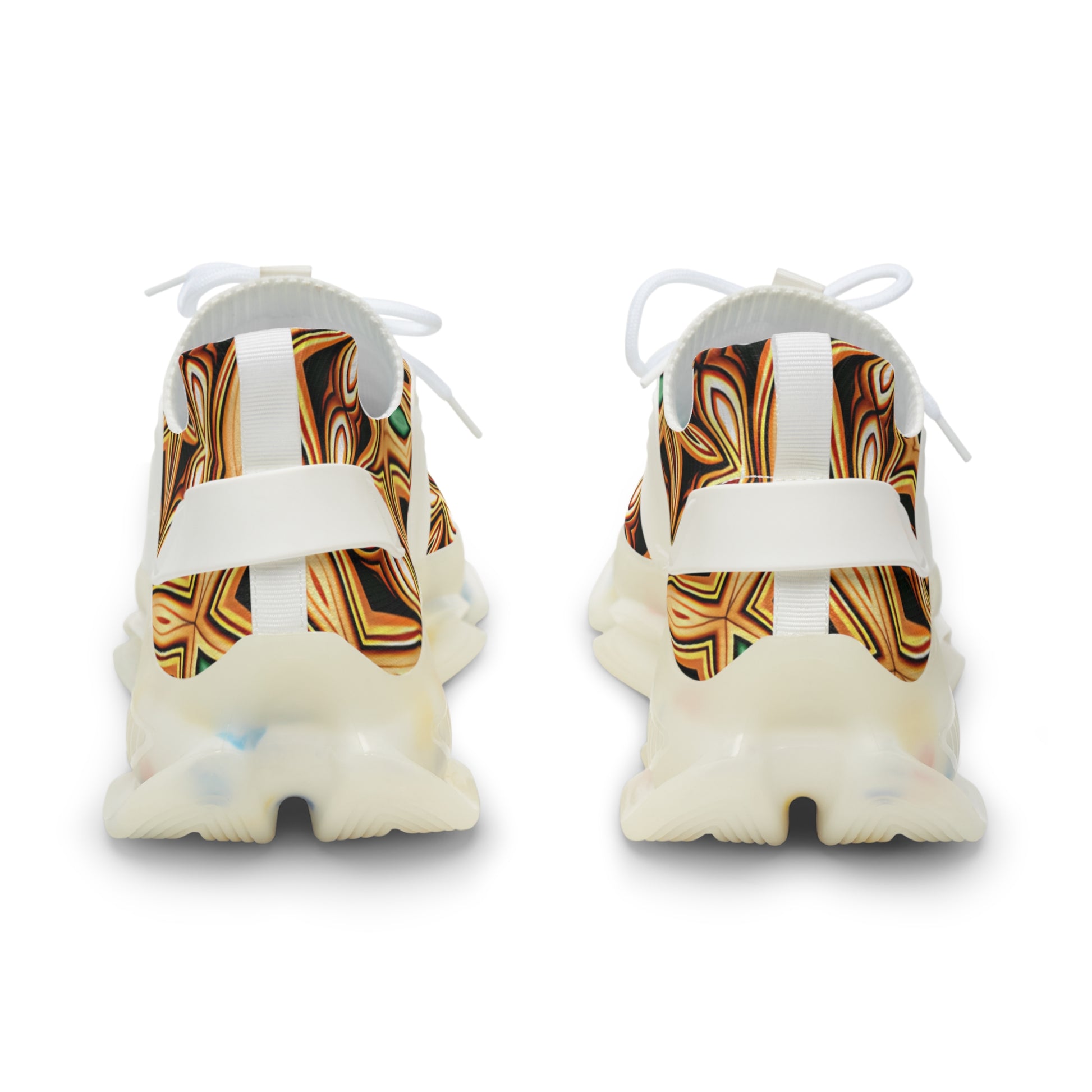 These mesh sneakers bring warm, geometric energy to everyday steps. The all-over printed mesh shows repeating diamond and star motifs in honey, rust, and teal — a look that reads hand-crafted and slightly vintage. Lightweight EVA and a TPU/EVA sole give a bouncy, cushioned ride while breathable deodorant memory foam insoles keep feet cool and fresh. KPU overlays add sculpted structure and weather-resistant durability. They lace up snugly and come with contrasting black or white detailing and stitching to match the sole color. Wear them with rolled jeans, travel layers, or a simple tee to let the pattern do the talking.